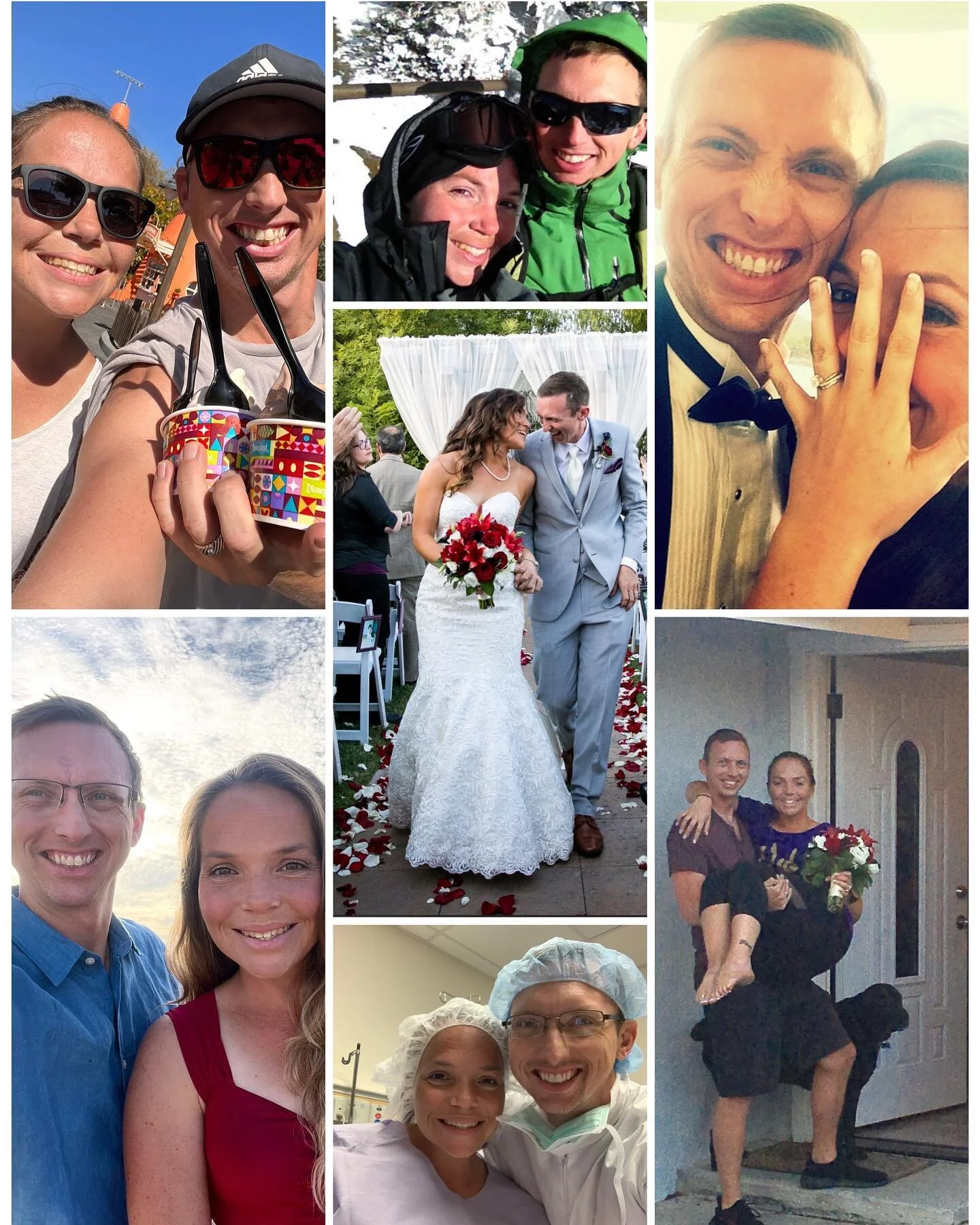 View fullsize Clockwise starting at the top: 1. one of our first photos on one of our first dates skiing at Mt. High - 2. Pure bliss shortly after proposing on a Princess Cruise in South America - 3. Carrying my bride across the thresh hold of our first house! - 4